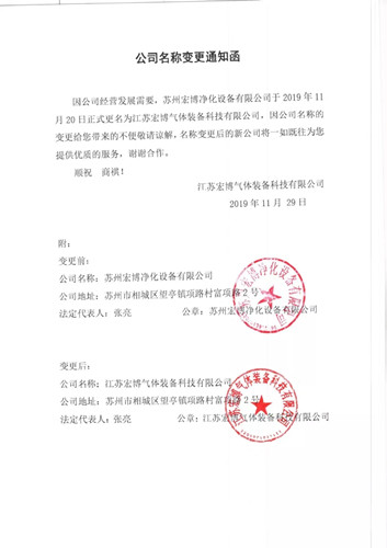 為適應市場經營和公司發(fā)展需要,2019年11月20日,經蘇州市相城區(qū)行政審批局核準,原“蘇州宏博凈化設備有限公司”正式變更登記為“江蘇宏博氣體裝備科技有限公司”。